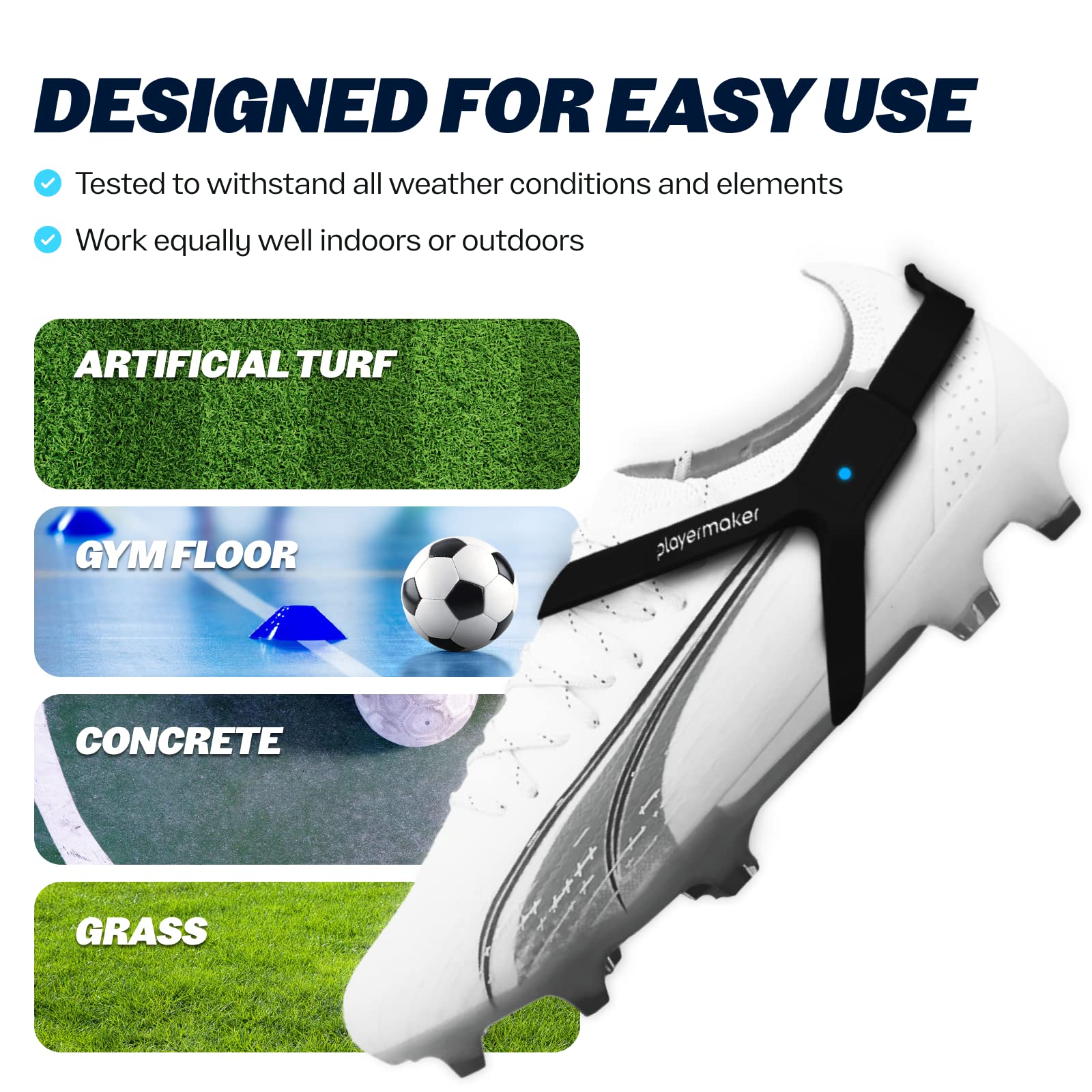 - Opciones de Tamaño Perfectas: Juega con comodidad y libertad de movimiento usando las correas duraderas y livianas del rastreador de actividad futbolística de Playermaker. Optimiza tu juego eligiendo entre Tamaño Mediano o Grande para el ajuste perfecto