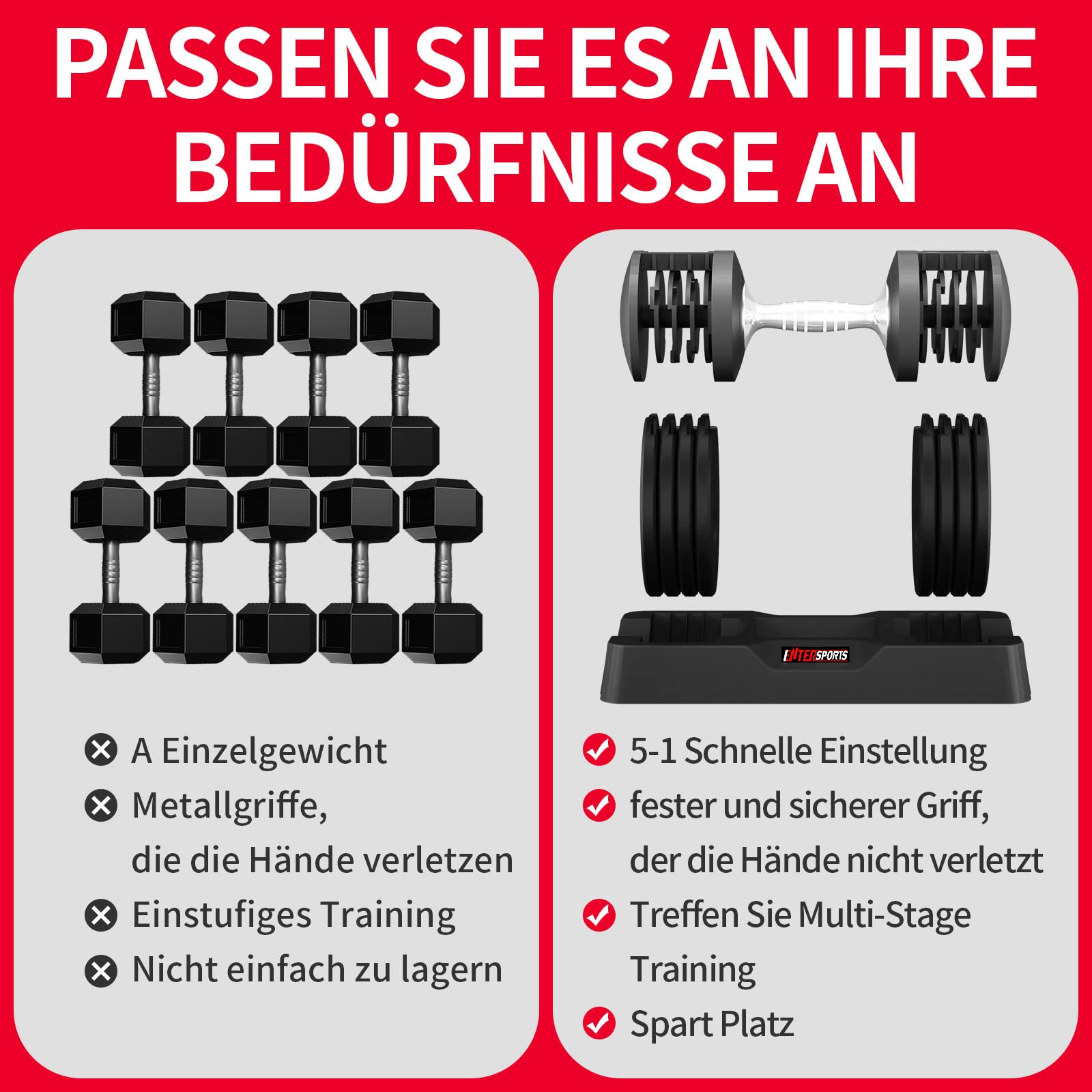 - ★ 【Pesos ajustables de 2 a 12 kg】:La mancuerna ajustable EnterSports tiene 5 pesos diferentes (2kg-4.5kg-7kg-9.5kg-12kg). Solo necesitas el espacio de 1 juego de mancuernas para obtener la experiencia de entrenamiento de 5 pesos diferentes. Puedes comenzar tu entrenamiento diario en casa