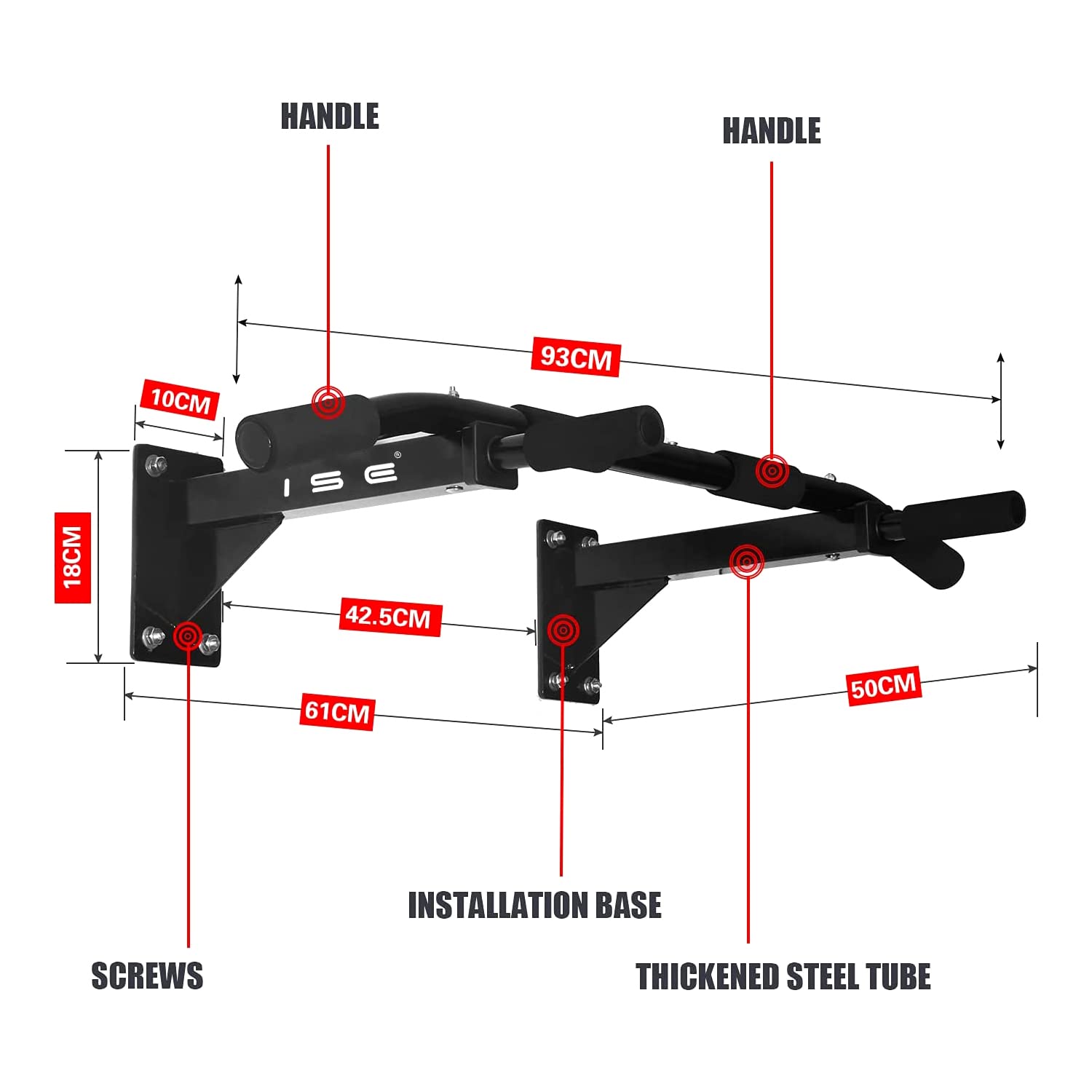 - Seguras y estables: ISE barra dominadas pared está hecha de tubos de acero de alta calidad, y su construcción estable y robusta permite que la barra soporte hasta 200 kg por lo que puedes entrenar fácilmente con pesas. Para una carga máxima, la barra de dominadas de levantamiento de la barbilla solo debe sujetarse a paredes resistentes. Las paredes de hormigón y piedra son las más adecuadas para la instalación.