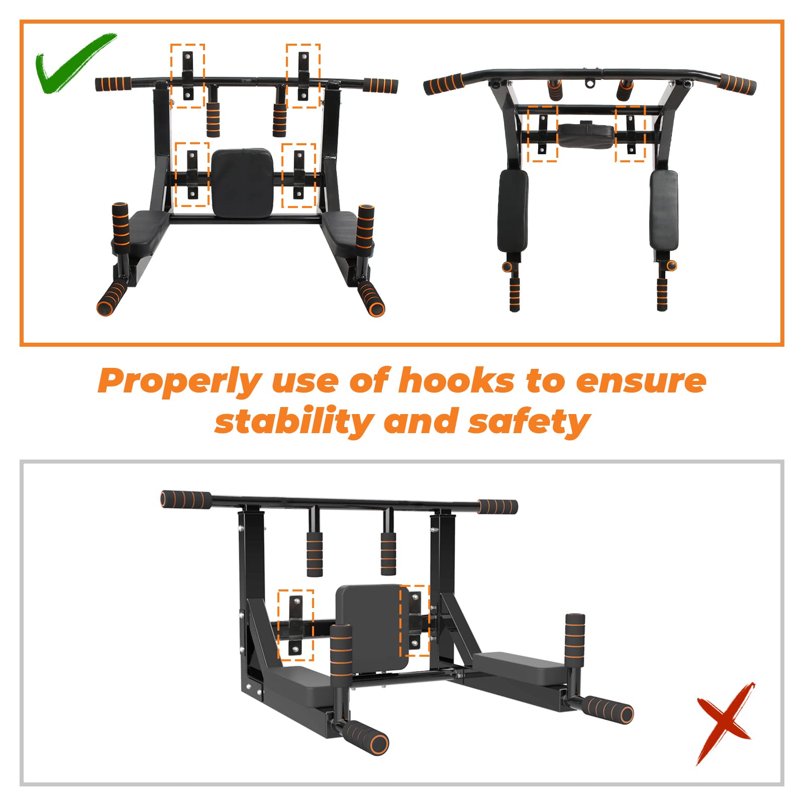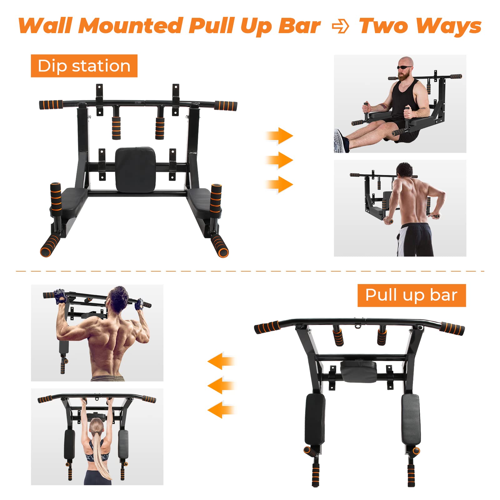 - Barra de Dominadas 2 en 1: El equipo de fitness montado en la pared se puede utilizar para dominadas y fondos, y es compatible con muchos tipos de ejercicios deportivos como dominadas, pull-ups, fondos, elevación de piernas y boxeo.