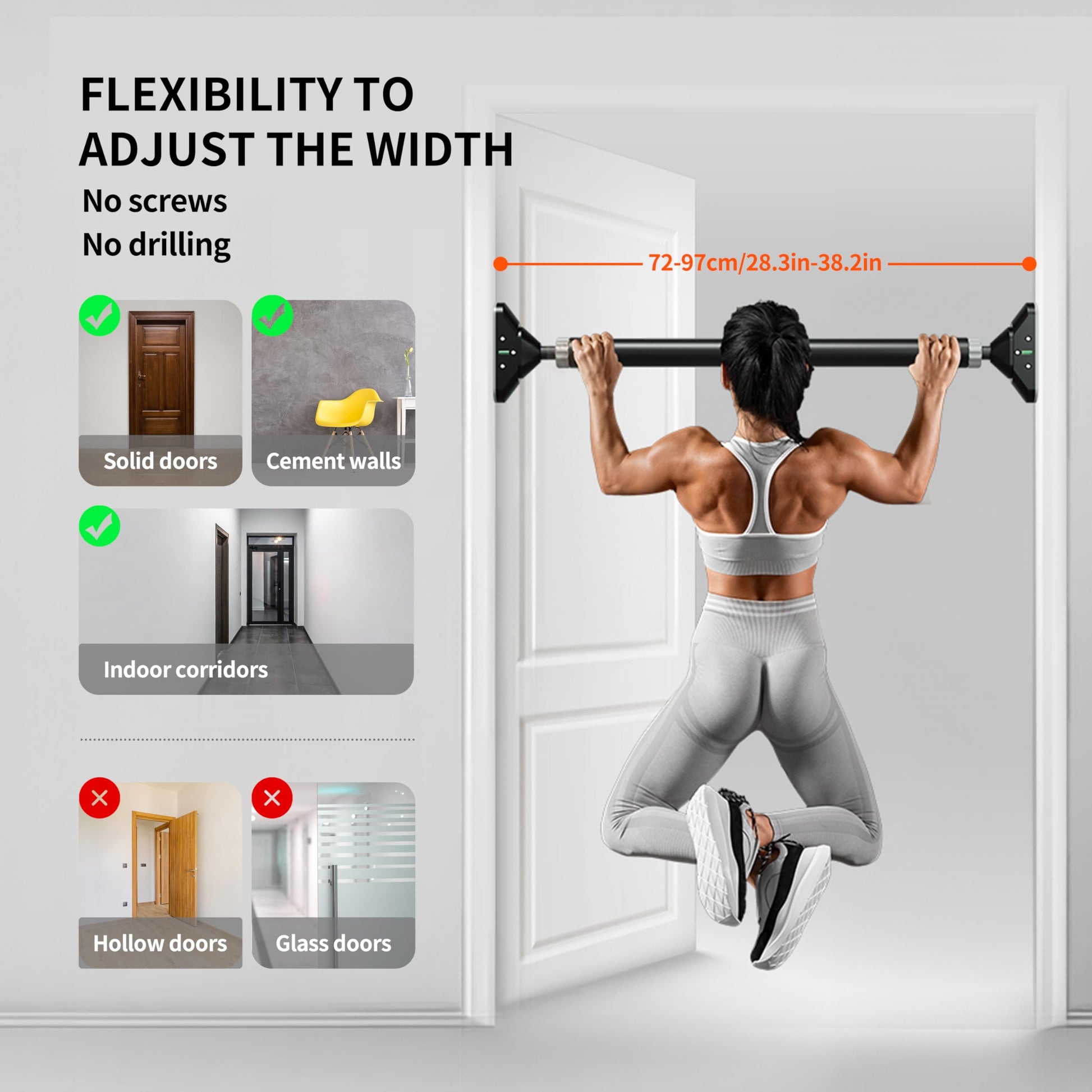 - 【Safe Workout Equipment】 Both ends of the pull up bar are made of non-slip soft material, 50*170mm rectangular rubber, with good friction ability. Our pull-up bar protects door frames against cracking. It is suitable for standard doors and can be easily installed on most door frames between 72cm and 97cm