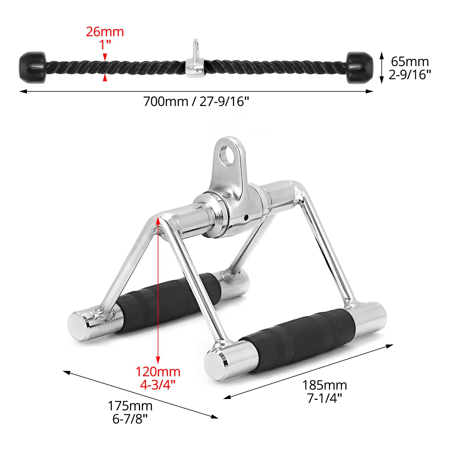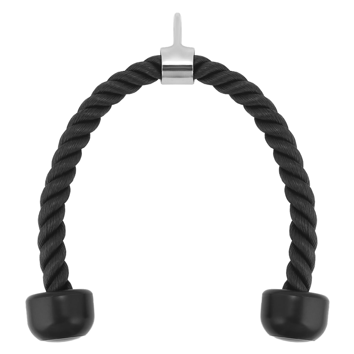 - Cable de tríceps: el cable de tríceps de 70 cm (27,5") está hecho de material de nailon de alta resistencia con un diámetro de 2,6 cm (1") y un anillo de metal resistente que se conecta fácilmente a los mosquetones en equipos de gimnasio estándar.