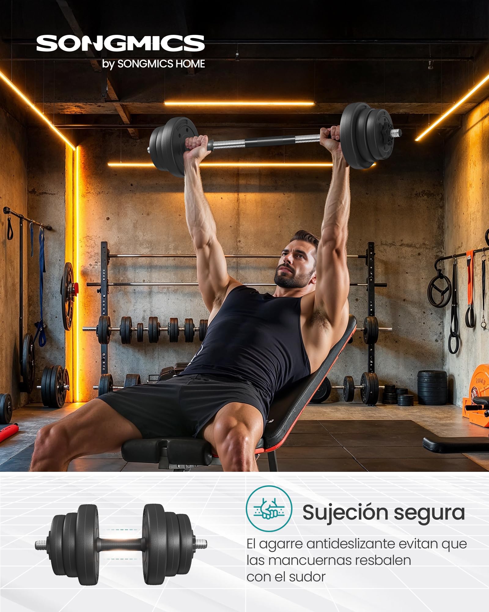 SONGMICS Juego de Mancuernas 2 en 1, Mancuernas Ajustables de 2 x 10 kg, con Barra Adicional, Placas de Peso Recubiertas de Plástico, Entrenamiento de Fitness, Gimnasio de Casa, Negro Tinta SYL20HBK